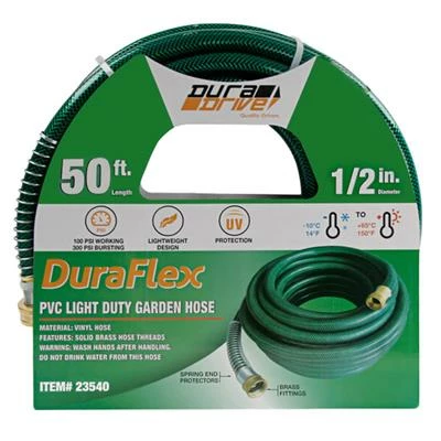 DuraDrive VG1250F 1/2 in. x 50 ft. PVC Light-Duty Garden Hose features flexible rubber and light-weight for easy handling, providing comfortable use for any light-duty watering chores. The weather-resistant and durable vinyl covers are ideal for everyday use. It also has solid brass full flow couplings and spring end protectors for long-lasting durability.