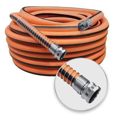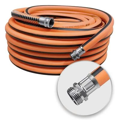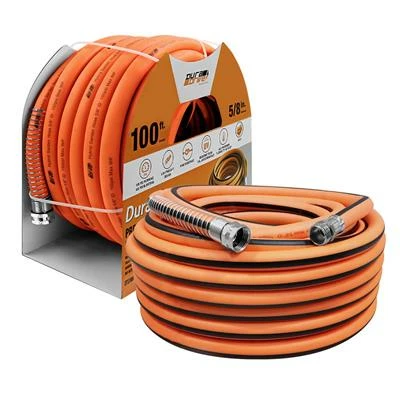 DuraDrive YPG58100F 5/8 in. x 100 ft. Hybrid Polymer Garden Hose is made from special blend of rubber PVC and PU materials offering all-weather flexibility, kink-resistant under pressure and excellent durability for heavy-duty chores. This hose has 3-ply (3 layers) construction, nickel plated brass hose threads and spring end protectors for long-lasting durability. Light-weight and resistant to UV, Oil and Chemicals.
