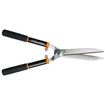 Fiskars 9178 23 in. PowerLever Serrated Hedge Shears. The Power-Leverยฎ Hedge Shears feature compound lever technology that multiplies your leverage to give you up to two times more cutting power than traditional single-pivot shears. Fully hardened, precision-ground steel blades feature a serrated edge to grip while cutting, and a patented self-sharpening design ensures that every cut is clean and crisp. A rust-resistant, low-friction coating makes every cut even easier, shock-absorbing bumpers absorb jarring vibrations and durable steel handles with non-slip grips offer control.