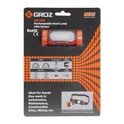 GROZ 220 3W COB Rechargeable Head Lamp with Sensor has innovative and unique design. Light can be separated from head band and used as a work light. In-built sensor function with hands free ON/OFF. Powered by COB LED technology, the GROZ LED/220 provides extremely powerful multiple output with bright and even illumination. Black woven head band with soft built-in protection pad avoids imprint on forehead. Light is attached to head band with a strong & powerful magnet. Battery can be recharged using a standard 1m long USB cable, provided with the light.