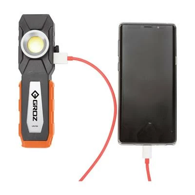 GROZ 396 500-Lumen Dual Use Rechargeable Handheld COB Worklight With Powerbank delivers extremely high output with uniform and even illumination torch. Smart design ensures user can control the output. Adjust light intensity of worklight and top torch by pressing ON/OFF buttons continuously. It has 360ยฐ rotating hook to suspend light leaving both hands free. Integrated pocket/belt clip is to conveniently store and carry light wherever you go. Clip also has a magnet to attach light to any metallic surface. Swiveling Stand Can be rotated full 180ยฐ to position light as needed. Battery can be recharged using Micro USB cable provided with the light. USB port is protected by rubber bezel.