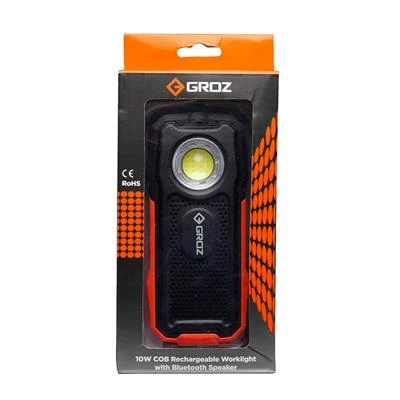 GROZ 397 500-Lumen Dual Use Rechargeable Handheld COB Worklight With Bluetooth Speaker is Multi-function, powerful worklight and top torch has a powerful speaker. The worklight delivers extremely high output with uniform and even illumination. The Bluetooth access is easy, simply press and hold the ON button for switching on the Bluetooth and connect to โBT500โ from your phone. The worklight has Impact proof and water resistant ABS body with rubber coating. 180ยฐ Swiveling stand with super strong magnets is used to position light on any metallic surface. Charge the battery using Type C USB cable provided with the light. USB port protected by rubber bezel.