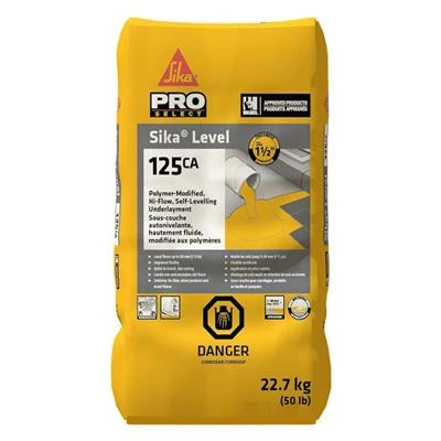 Sika Level-125CA 22.7kg Polymer-Modified Hi-Flow Self-Leveling Underlayment is a one-component, polymer and Viscocrete modified cementitious underlayment for interior concrete, cementitious, wood and tiled substrates. Its hi-flow, self-levelling properties allow it to be applied, either manually or by pump, to produce a fast-setting, flat and economical substrate prior to the application of a final floor finish. Typical application thickness is 1 to 38 mm (1/25 to 1 1/2 in).